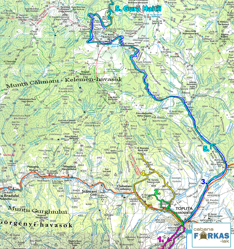Itinerarul cu numărul 3 pornește de la cabana Farkas, de la o altitudine de 730m. La ieșirea din Toplița spre Borsec, la confluența părăului Lomaș urmăm drumul forestier lat. Maghiarii din zonă cunosc acest loc sub denumirea de ”Castel”, deoarece pe vremuri aici segăsea castelul vânătoresc în stil elvețian al familiei Urmánczy. Drumul nostru va trece pe lângă izvoare de apă minerală și pârâuri. Până să ajungem la confluența cu Pârâul Doamnei Vajda găsim mai multe cruci de lemn creștin ortodoxe, amplasate în aceași perioadă cu construirea mănăstirii de pe câmpul Izvoarele. De la câmpul Izvoarele mergem mai departe pe un drum mai îngust și ceva mai dificil de parcurs spre lacul glaciar Bánffy, azi cunoscut sub numele de lacul Iezer, rezervație naturală. Accesul spre acest loc cu automobile este imposibil. Lacul Iezer își are originea în ultima perioadă glaciară, în locul căruia se afla o morenă frontală sau terminală, iar resturile de roci au format un strat argilos și impermeabil, lucru care a permis nașterea lacului. Printre plantele rare și ocrotite putem admita jneapănul, ienupărul, floarea reginei, ierburile Aira caespitosa. Toate animalele prădătoare mari cât și mamiferele mari specifice zonei le regăsim aici. Aici o să luăm masa ce constă în bucate tradiționale ardelenești și specialități culinare locale. Apoi ne îndreptăm spre Vârful Rățitiș, traseu ce se încadrează în categoria extremă. Putem accesa zona doar cu mașină de teren specială bine echipată în cazul în care nu optăm pentru o plimbare pe jos. După cucerirea vârfului urmează mina de sulf. Ca o rană uriașă ni se dezvăluie cariera de sulf. Vârful de culoare galbenă-roșiatică a fost rasă nu numai din exterior, dar s-a distrus împreună cu aceasta și sistemul de grote unicat în lume cu stalagmite bogate în oxizi de fier și o sală decorată cu stalactite ce purta numele de Palatul de Ciocolată. Exploatarea în formă de piramidă a început în anul 1960, concomitent cu construirea clădirilor de blocuri de locuințe pentru muncitori. Nu găsim nici urmă de plante sau animale, omul are impresia că se plimbă pe lună când ajunge între clădirile acestui oraș fantomă.